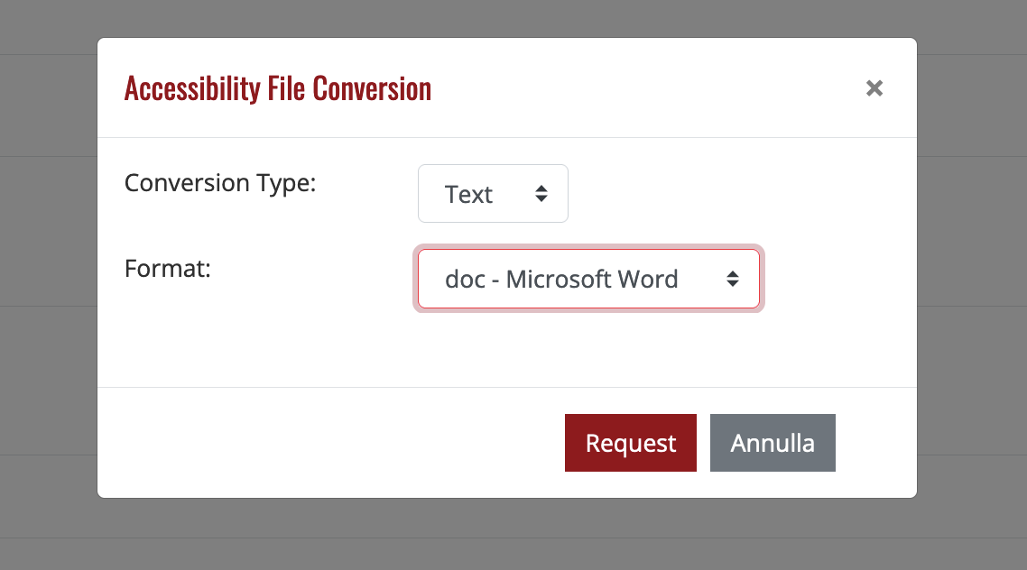 Clicca su Request per richiedere il file nel formato alternativo. Riceverai una notifica in Moodle e tramite email quando il file sarà disponibile.